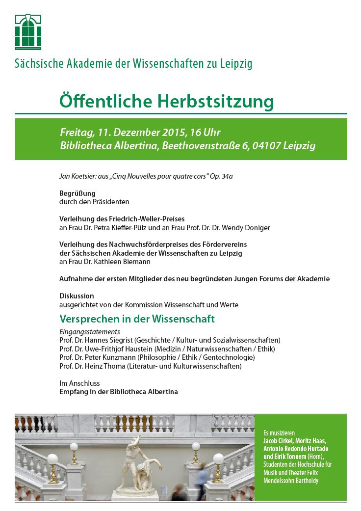 Die Sächsische Akademie der Wissenschaften zu Leipzig lädt für den 11. Dezember 2015 zur Öffentlichen Herbstsitzung in die Bibliotheca Albertina ein. Anders als gewohnt wird die diesjährige Herbstsitzung den festlichen Rahmen für eine öffentliche Diskussionsrunde bieten: Vertreter der Kommission Wissenschaft und Werte debattieren über ein aktuelles Thema von gesellschaftlicher Brisanz: „Versprechen in der Wissenschaft“. Interessenten sind herzlich willkommen.