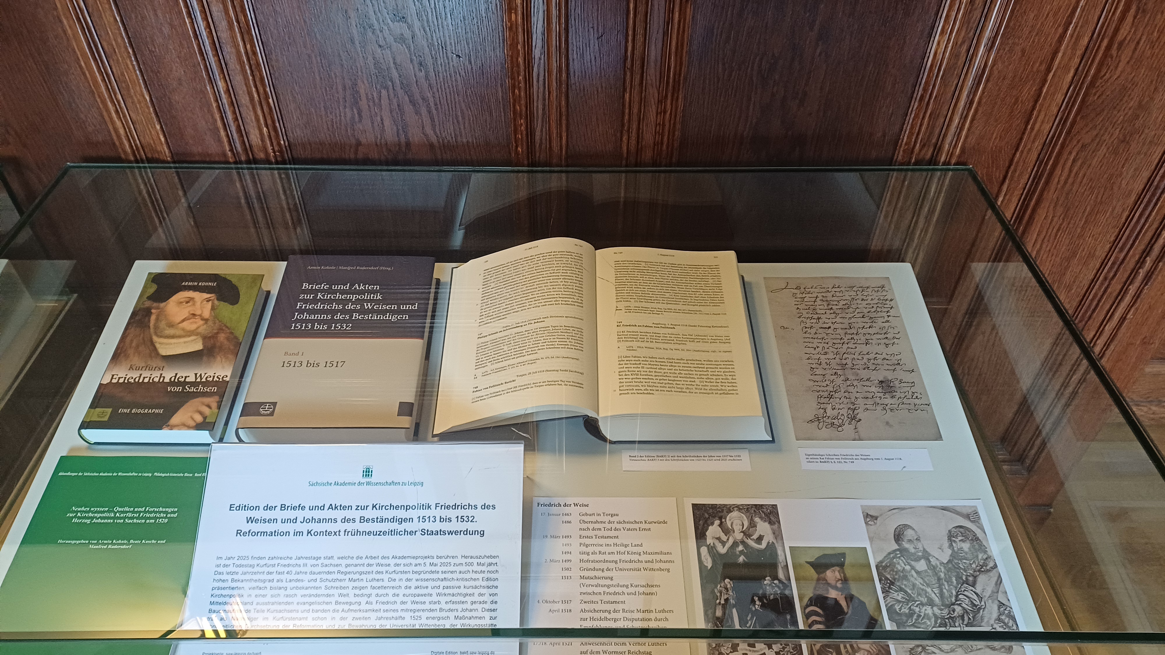 Auch auf vielfältige andere Weise widmet sich das Projekt dieser Tage dem Gedenken an Kurfürst Friedrich: Im Foyer der Sächsischen Akademie der Wissenschaften in der Karl-Tauchnitz-Straße 1 ist eine Vitrine zu seinen Ehren zu sehen. Der Projektleiter Prof. Dr. Armin Kohnle wird am 11. Mai, um 10 Uhr in einem Gedenkgottesdienst für Friedrich den Weisen in der Wittenberger Schlosskirche predigen. Um 14 Uhr stellt er in der benachbarten Reformationsgeschichtlichen Forschungsbibliothek seine jüngst bei der Evangelischen Verlagsanstalt erschiene Biografie Friedrichs des Weisen vor. Last but not least wird noch im Jubiläumsjahr 2025 der dritte Band unserer Edition erscheinen, der die Jahre 1523 bis 1525 umfasst und somit auch Quellenstücke bietet, die den Tod Kurfürst Friedrichs und den Übergang der Regierung an seinen jüngeren Bruder Johann thematisieren.