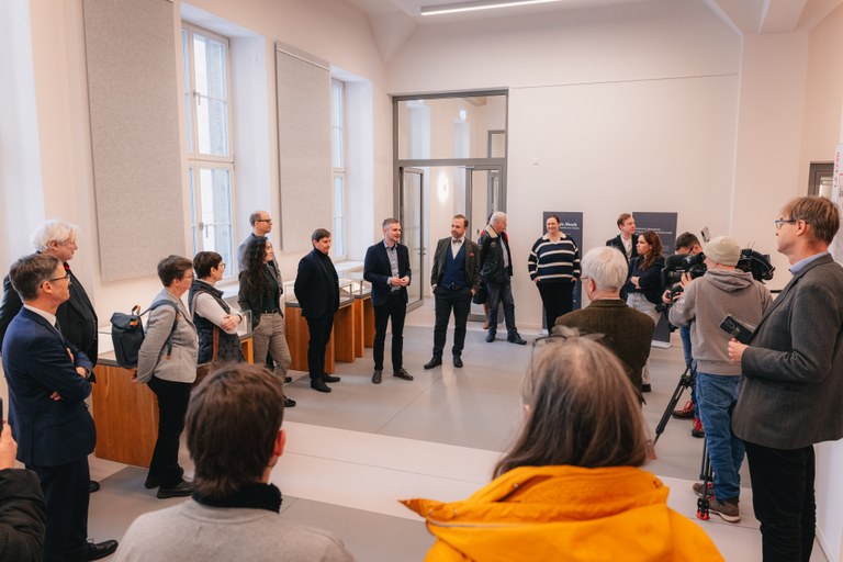 - Präsentation der Handschriftenfunde im Stadtarchiv Leipzig, v.l.: Prof. Dr. Peter Wollny, Direktor des Bach-Archivs Leipzig; Prof. Dr. Hans-Joachim Knölker, Präsident der Sächsischen Akademie der Wissenschaften zu Leipzig; Dr. Bernd Koska, Mitarbeiter im Forschungsportal BACH; Dr. Michael Ruprecht, Direktor des Stadtarchivs Leipzig. Foto: Christian Kern