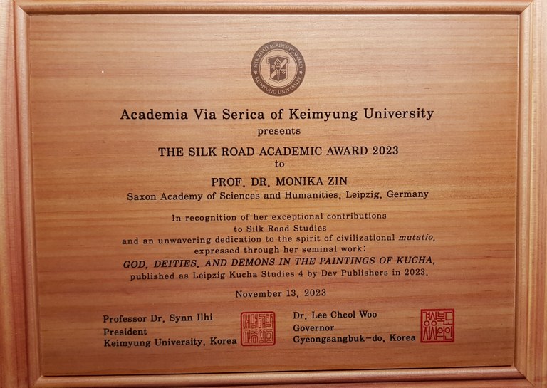 Das Vorhaben Wissenschaftliche Bearbeitung der buddhistischen Höhlenmalereien in der Kuča-Region an der nördlichen Seidenstraße erschließt mehr als tausend Jahre alte Wandmalereien buddhistischer Höhlenanlagen an der nördlichen Seidenstraße. Das Vorhaben unter der Arbeitsstellen-Leitung von Prof. Dr. Monika Zin wurde 2023 für Band 4 der Reihe Kucha Studies Gods, Deities, and Demons in the Paintings of Kucha mit dem renommiertem Keimyung Silk Road Award ausgezeichnet.