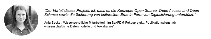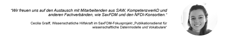 "Wir freuen uns auf den Austausch mit Mitarbeitenden aus SAW, KompetenzwerkD und anderen Fachverbänden wie SaxFDM und den NFDI-Konsortien.“, ergänzt Cecilia Graiff, wissenschaftliche Hilfskraft im Fokusprojekt. Geplant ist unter anderem, dass in Zusammenarbeit mit dem Partnernetzwerk des KompetenzwerkD (SAW, GWZO, DI, HAIT, ISGV, SI) Use Cases für den Publikationsdienst entwickelt werden. Auch Vokabulare und Ontologien vorhandener Projekte sollen aufbereitet werden.