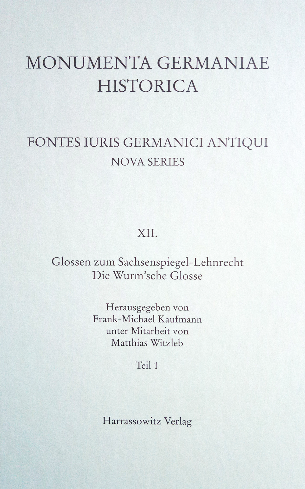 - XII. Glossen zum Sachsenspiegel-Lehnrecht. Die Wurmʼsche Glosse. Herausgegeben von Frank-Michael Kaufmann, unter Mitarbeit von Matthias Witzleb. 2 Teilbände, LXXIV, VIII + 752 Seiten sowie 16 S. farb. Abb. in 2 Teilen. 8°. 2024. Festeinband