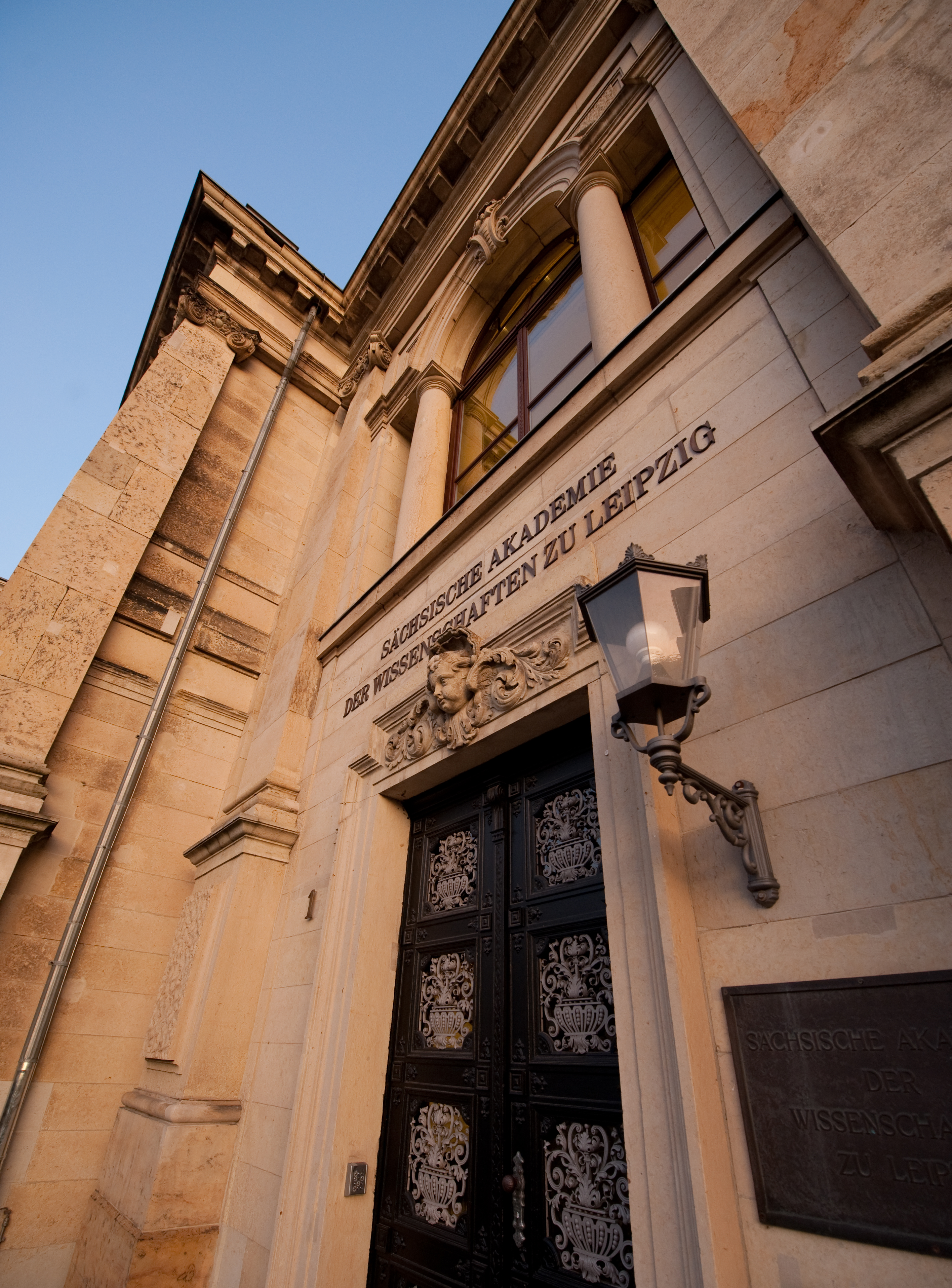 Eingangsportal einer historischen Villa, über der Tür steht "Sächsische Akademie der Wissenschaften zu Leipzig"