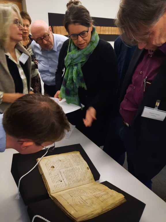 Im Anschluss standen die sogenannten Basler Rezepte, die ältesten medizinischen Rezepte in deutscher Sprache, im Zentrum. Sie sind in der Handschrift Basel, Universitätsbibliothek, Cod. F III 15a aus der Zeit um 800 unikal erhalten. Unter dem Titel "Im Schnittpunkt der Traditionen: Die Basler Rezepte und ihre Kontexte" stellte Almut Mikeleitis-Winter diese einzigartige Überlieferung in den Spannungsfeldern von Latein und Volkssprache, insularer und kontinentaler Tradition bzw. Schreibpraxis, Medizin und Magie vor. Dank der Unterstützung der Handschriftenabteilung der Universitätsbibliothek Basel mit Dr. Monika Studer konnte anschließend der wertvolle Kodex im Original präsentiert werden. Hier ließ sich die außergewöhnliche Eintragungsform der Rezepte unmittelbar nachvollziehen, wobei auch der weitere Überlieferungszusammenhang der Handschrift mit den zahlreichen astro-chronologischen Darstellungen und Diagrammen großes Interesse fand.