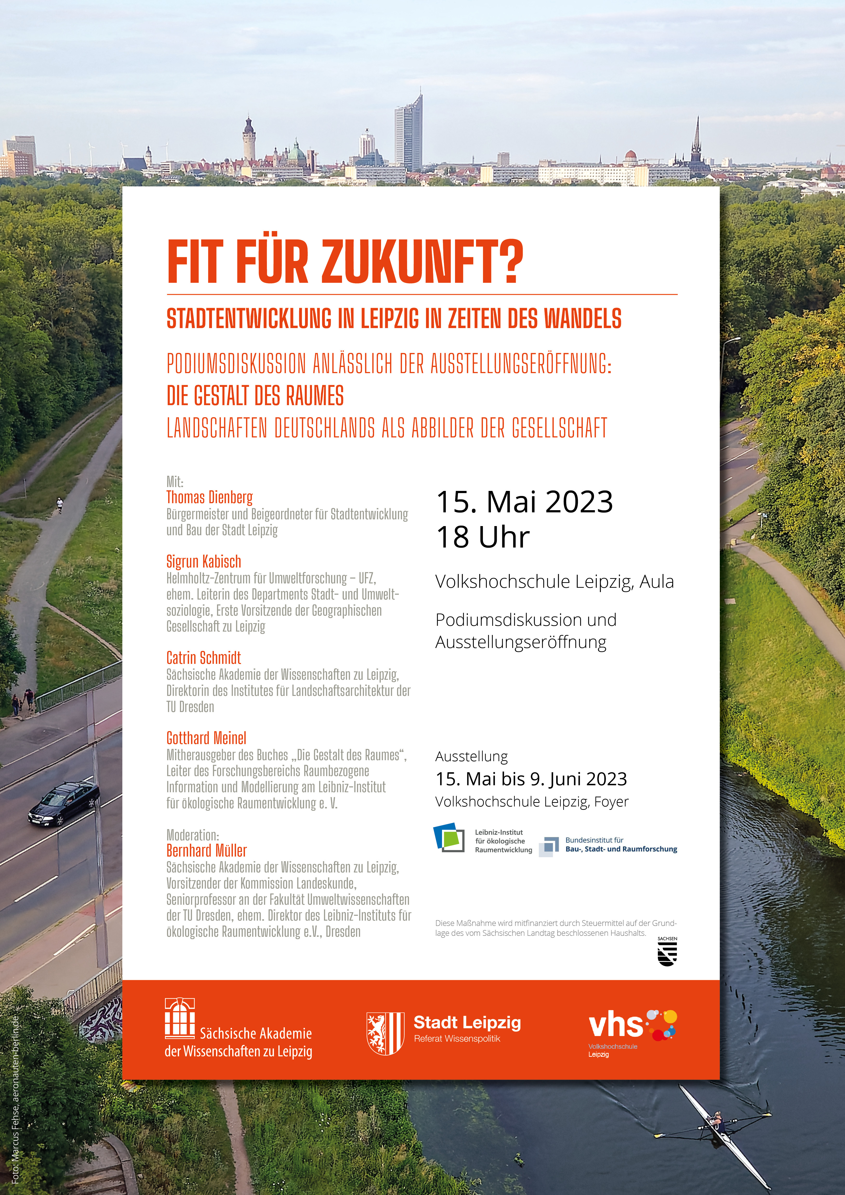 Klimawandel, Energiewende, Verkehrswende, demographischer Wandel und Zuwanderung, Probleme auf dem Wohnungsmarkt? Und bei alledem ein gutes Leben in der Stadt und auf dem Land? Wie gut sind unsere Stadtregionen in Deutschland, allen voran Leipzig, auf die Herausforderungen der Zukunft vorbereitet? Was können Stadtplanung, Stadtentwicklung und Stadtforschung dazu beitragen? Und was können Bürgerinnen und Bürger tun? Darum geht es bei der Podiumsdiskussion „Fit für Zukunft? – Stadtentwicklung in Leipzig in Zeiten des Wandels“ am 15. Mai 2023 ab 18 Uhr in der Aula der Volkshochschule Leipzig. Sie richtet sich an alle Bürgerinnen und Bürger aus Leipzig und seinem Umland, die an Themen der Stadt- und Regionalentwicklung interessiert sind. Gemeinsam mit Leipzigs Bürgermeister für Stadtentwicklung und Bau, Thomas Dienberg, diskutieren Expertinnen und Experten über die vor uns liegenden Konflikte und Chancen der Raumnutzung und wie wir damit umgehen können. Für die Besucherinnen und Besucher der Veranstaltung besteht die Möglichkeit, sich aktiv an der Diskussion zu beteiligen. Die Podiumsdiskussion bildet den Auftakt zur Ausstellung Die Gestalt des Raumes – Landschaften Deutschlands als Abbilder der Gesellschaft, die sich mit der Vielfalt von Landschaften und Landschaftswandel sowie mit dem schwierigen Spagat zwischen Bewahrung und Veränderung auseinandersetzt. Die Ausstellung beruht auf dem gleichnamigen Bildband, der im Jahr 2022 erschienen ist. Bei der Eröffnung werden Autorinnen und Autoren sowie die Fotografen der gezeigten Exponate anwesend sein. Die Ausstellung ist bis zum 9. Juni 2023 im Foyer der VHS Leipzig zu sehen.