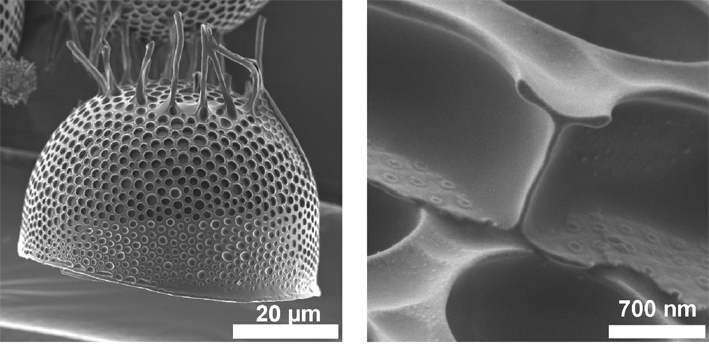 Diatomeen sind wichtige Modellorganismen für das Studium der Biomineralisation, weil sie außerordentlich filigrane, hierarchisch strukturierte Zellwände aus Biosilikat besitzen (s. Abbildung 1) und zudem leicht im Labor gezüchtet sowie inzwischen auch genetisch manipuliert werden können. Diatomeen sind wesentliche Bestandteile des Phytoplanktons. Weltweit existieren etwa 200.000 verschiedene Diatomeenspezies, sowohl im Salzwasser als auch im Süßwasser. Man nimmt an, dass Diatomeen für mindestens ein Viertel der Biomasse-Primärproduktion in den Weltmeeren verantwortlich sind.