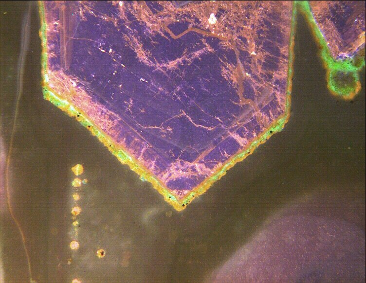 Seit längerem wurden die Ursachen für das Auftreten von Schwarmbeben im Raum Vogtland/NW-Böhmen diskutiert. Neben der Ausbildung eines tektonischen Spannungsfeldes sind Porendruckvariationen ein wichtiger Effekt, der dieses spezielle Bruchverhalten induzieren könnte. Diese Diskussion wurde noch um den wichtigen Aspekt der hydrothermalen Alteration, also dem Anlösen von Gestein und Mineralien unter erhöhten Druck- und Temperaturbedingungen, erweitert. CO2 ergibt mit Wasser eine Säure, welche schon in relativ kurzer Zeit die kluftbildenden Minerale anätzt und damit mechanisch schwächt (siehe Bild rechts mit einem unter Kathodolumineszenz angeregten Quarzkristall). Diese physikalische Schwächung durch einen chemischen Lösungsprozess erfolgt seit geologischen Zeiträumen auf den verbundenen Kluftzonen, nicht nur im Vogtländisch-NW-Böhmischen Raum. Auch in vielen anderen Regionen der Erde, wo Schwarmbeben auftreten, sind aggressive Fluide, meist in Verbindung mit CO2, präsent. Wir haben diesen wichtigen Aspekt in einer Publikation vertiefend herausgearbeitet.
